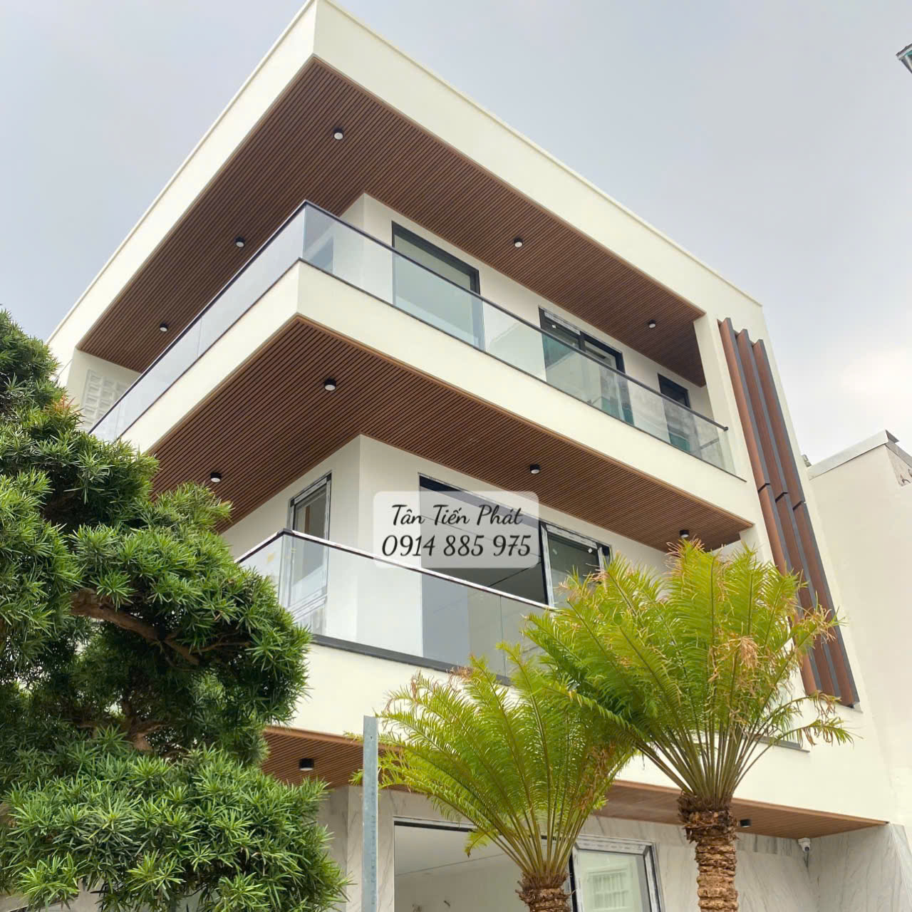 Một công trình nổi bật với hệ lam chắn nắng gỗ nhựa ASA được thiết kế xen kẽ, tạo điểm nhấn hiện đại, đồng thời giúp giảm nhiệt, cản bụi và tăng độ riêng tư. Màu sắc trầm ấm kết hợp cùng kiểu dáng thanh thoát khiến tổng thể công trình trở nên nổi bật và đẳng cấp.